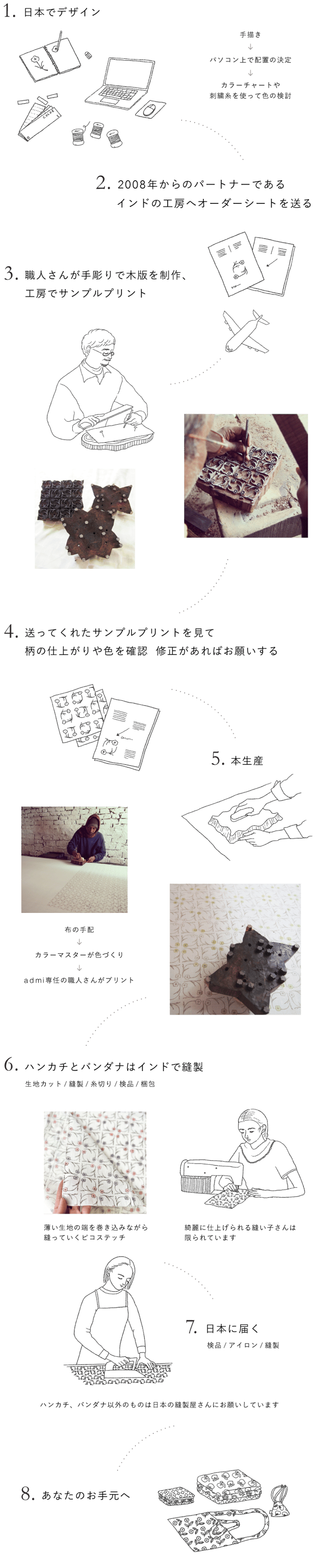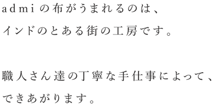 ブロックプリントに出会い、たくさんの手間と時間をかけて出来上がる布に衝撃を受け、居候先の工房の端っこでペタペタとプリントさせてもらう。素敵なホストファミリーに「また来るね」と約束して帰国。2008年にadmi をはじめる。居候しているお家の部屋のベッドの上でブランド名とロゴマークを決めた。