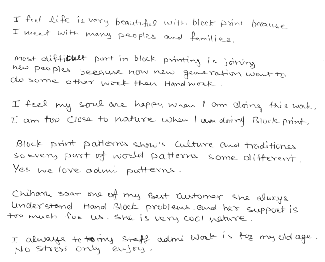 ブロックプリントにおいて最も困難な点は、若い人々に次の担い手となってもらう事です。